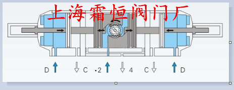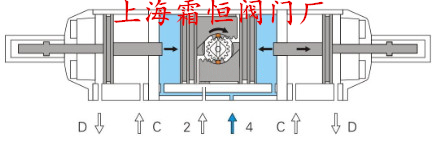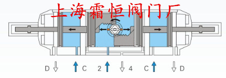 氣源壓力同時(shí)進(jìn)入2口和D口,空氣從4口和C口排出,2口作為內部活塞移動(dòng),D口是通過(guò)輔助活塞推桿限制內部